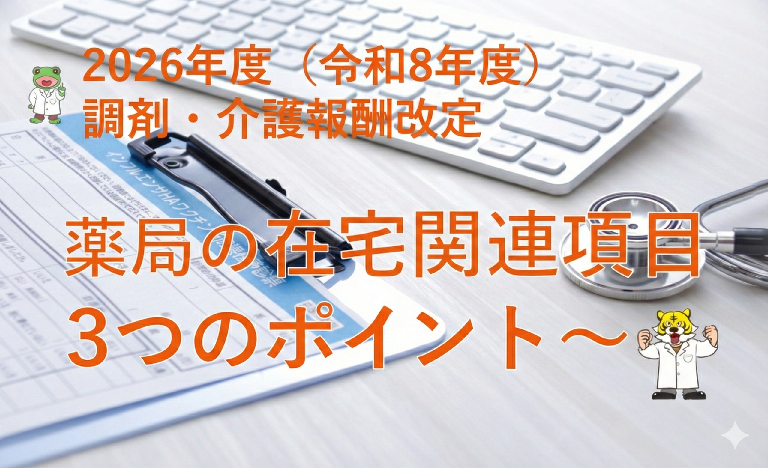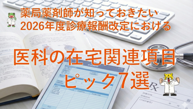 保険点数 2026年度(令和8年度)調剤報酬改定~薬局の在宅関連項目3つのポイント~ 2026年2月13日 Pharma01 アウトドア薬局 2026年度(令和8年度)は調剤報酬改定です! 今回の記事では、薬局の在宅関連項目についての改定項目を取り上げて解説します。 個人的な感 …